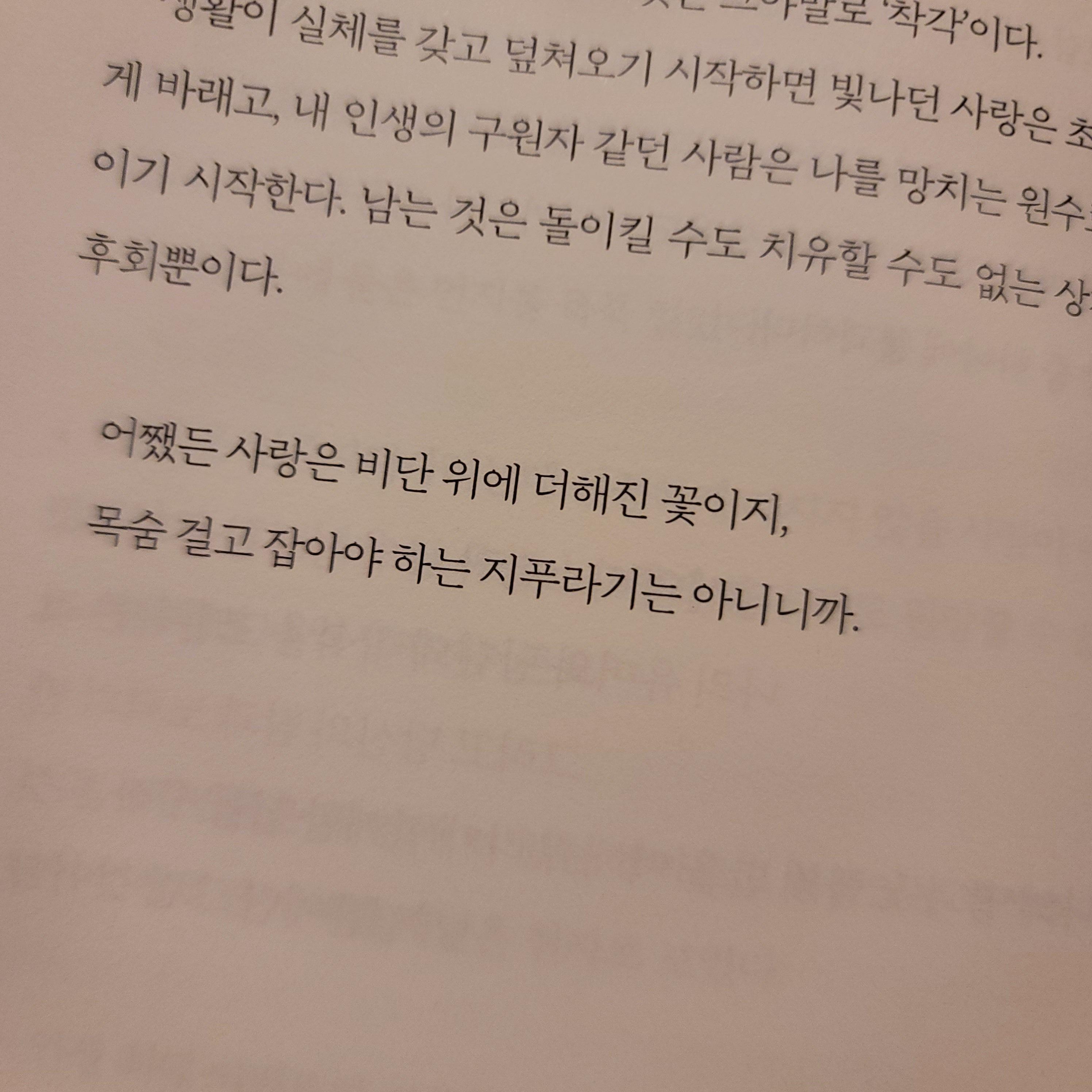 사랑만 있으면 뭐든 다 할 수 있고 어떠한 역경도 헤쳐나갈 수 있다는 믿음으로 결혼을 하는 신념에 대해 작가는 얘기한다. "어쨌든 사랑은 비단 위에 더해진 꽃이지. 목숨 걸고 잡아야 하는 지푸라기는 아니니까."라고 말이다.