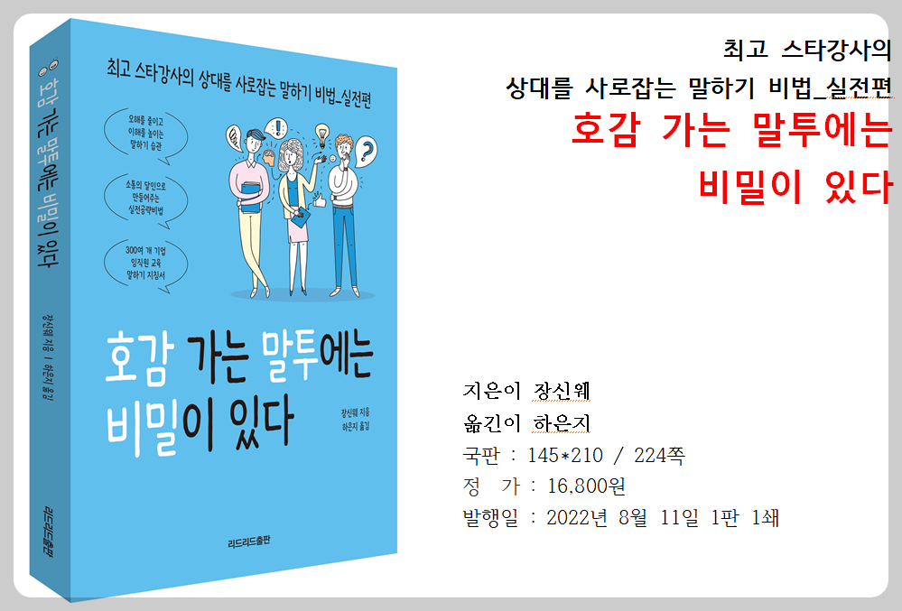 자기 계발 책이다. 상대를 사로잡는 대화를 할 수 있다면 그리고 호감 가는 말투를 구사하는 사람들을 볼 수 있다. 나도 저들처럼 대화를 자연스럽게 하고 상대에게 호감을 주는 말투를 동경한 적이 있을 것이다. 그러나 이 모든 것은 저절로 생기는 것이 아니다. 비밀이 있는 것이다.