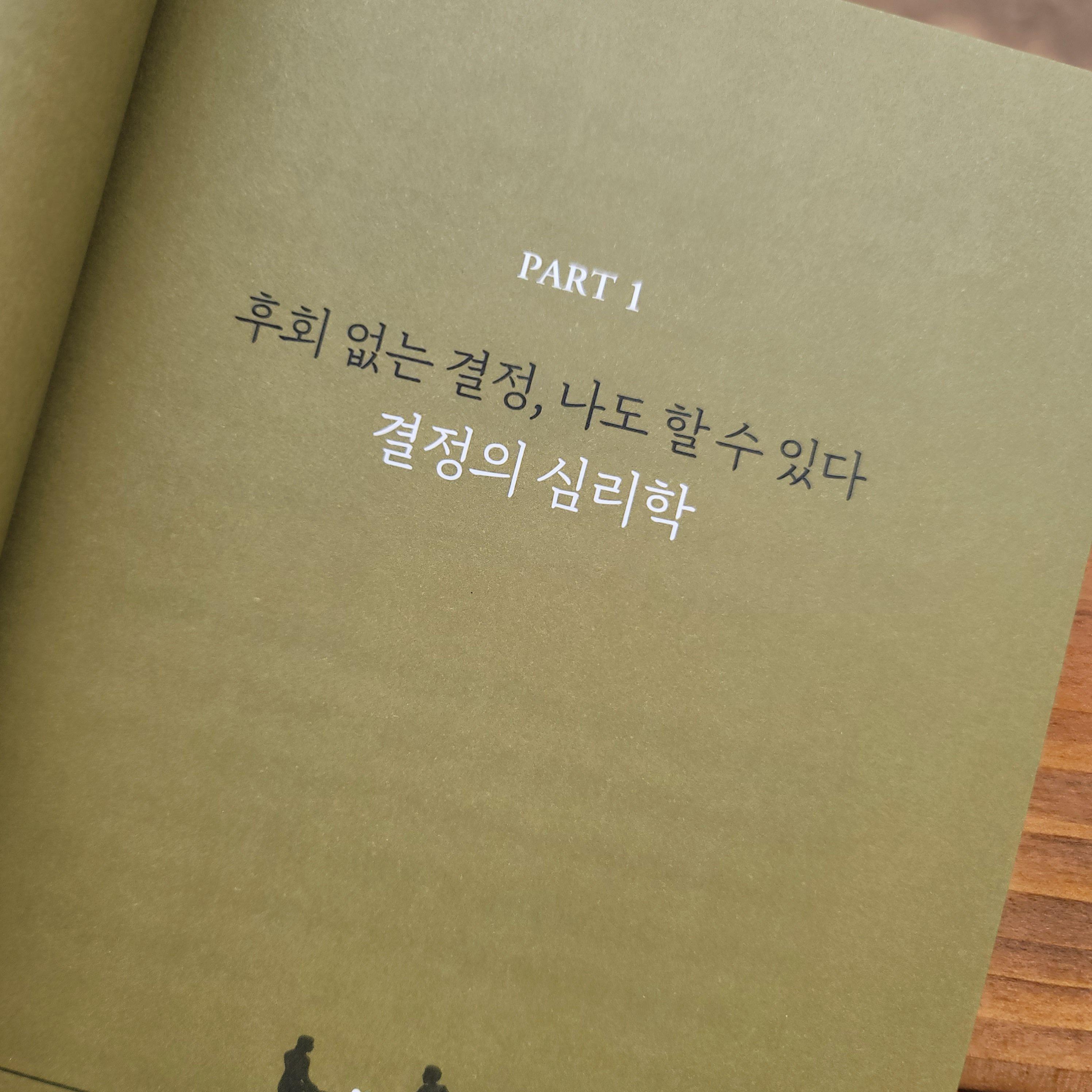 먼저 파트 1의 후회 없는 결정, 나도 할 수 있다는 '결정의 심리학'에 대해서 다뤘다. 무의식이 나를 지배하고, 생각이 많을수록 만족도가 떨어지는 이유, 결정을 잘하기 위해 필요한 자제력, 집중해야 좋은 결정을 할 수 있고, 물건값의 함정에 소지 않는 법에 대해 수록되어 있다.