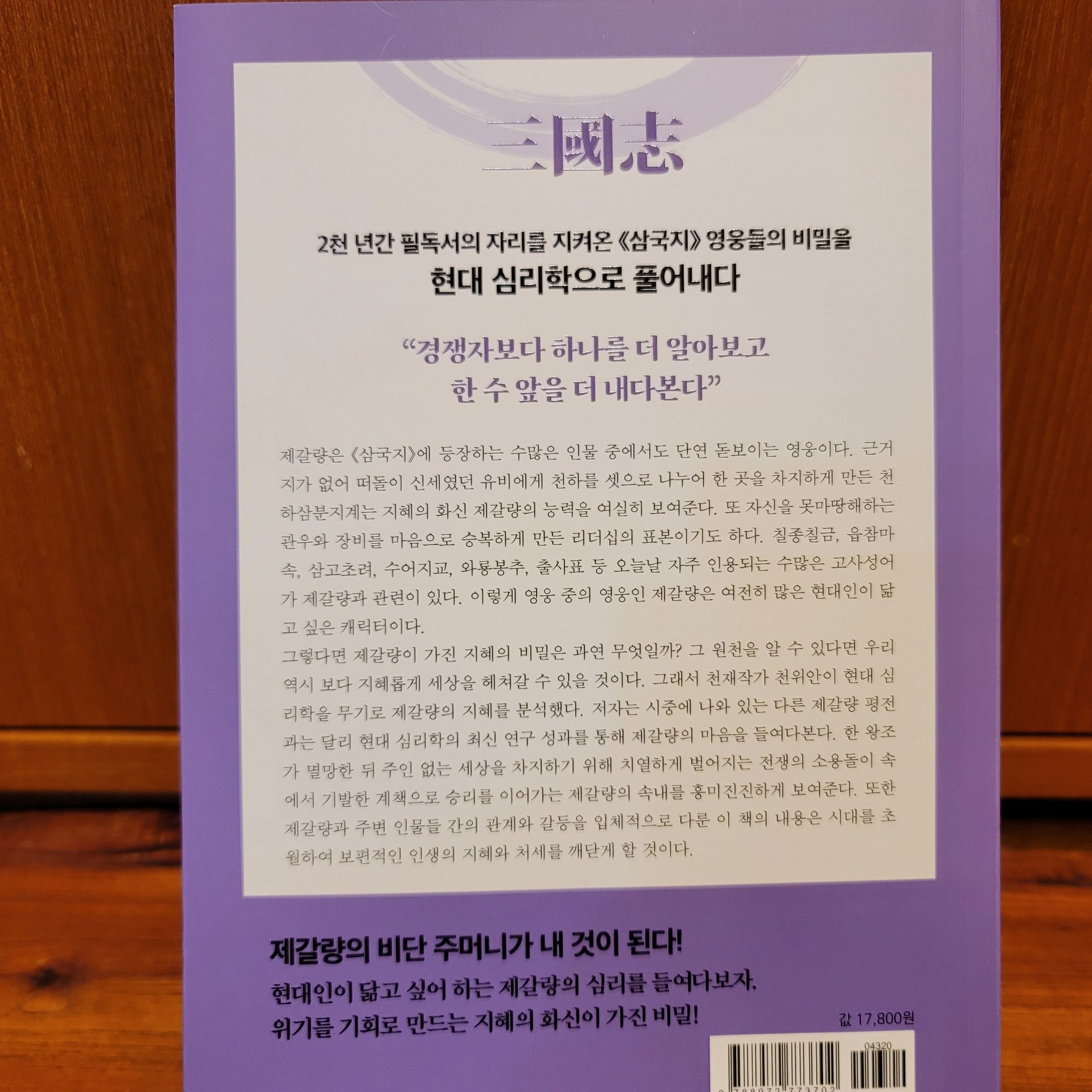 삼국지에서 제갈량을 빼고는 얘기가 불가하다. '심리학이 제갈량에게 말하다' 제갈공명의 심리를 알 수 있는 기회가 되었다. 범접하지 못할 뿐만 아니라 그런 생각 조차 하지 못했던 제갈량의 심리. 역시 그도 인간이었다.