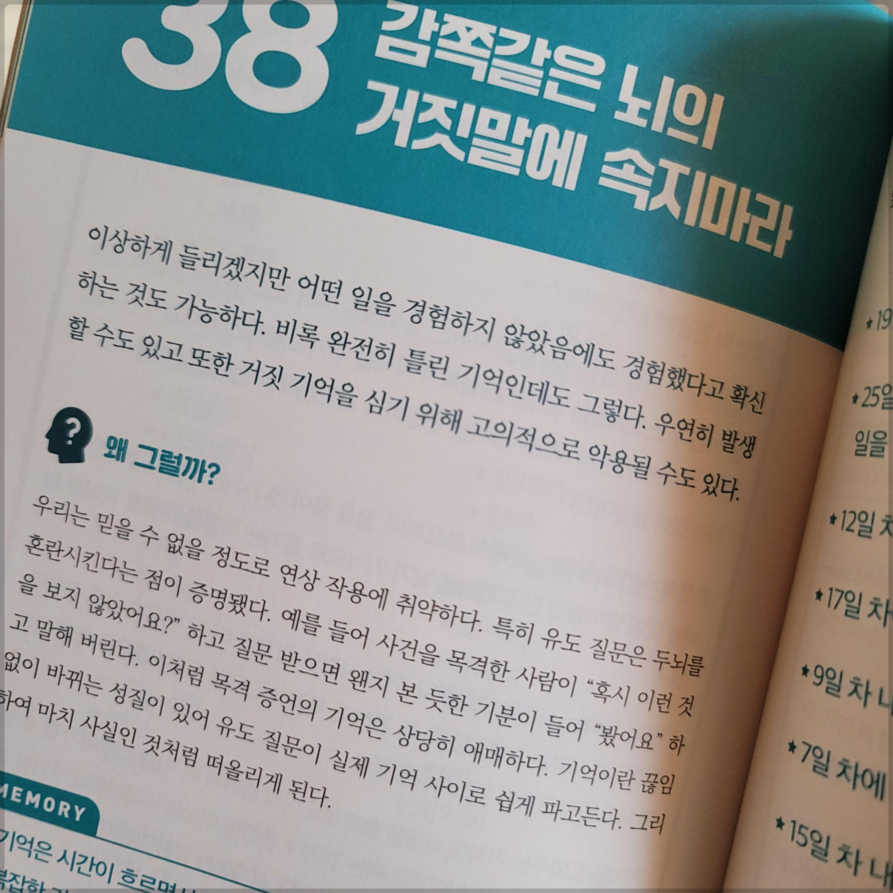 38일 차 내용의 "감쪽같은 뇌의 거짓말에 속지 마라"는 많은 생각을 하게 된다. 내가 기억하는 경험 했다고 믿거나, 분명하다고 믿는 많은 일들이 실제로는 아니라는 것이다. 연구를 통해 불가능한 사건이 마치 일어났다고 믿는 것도 가능하다고 밝혀졌다.