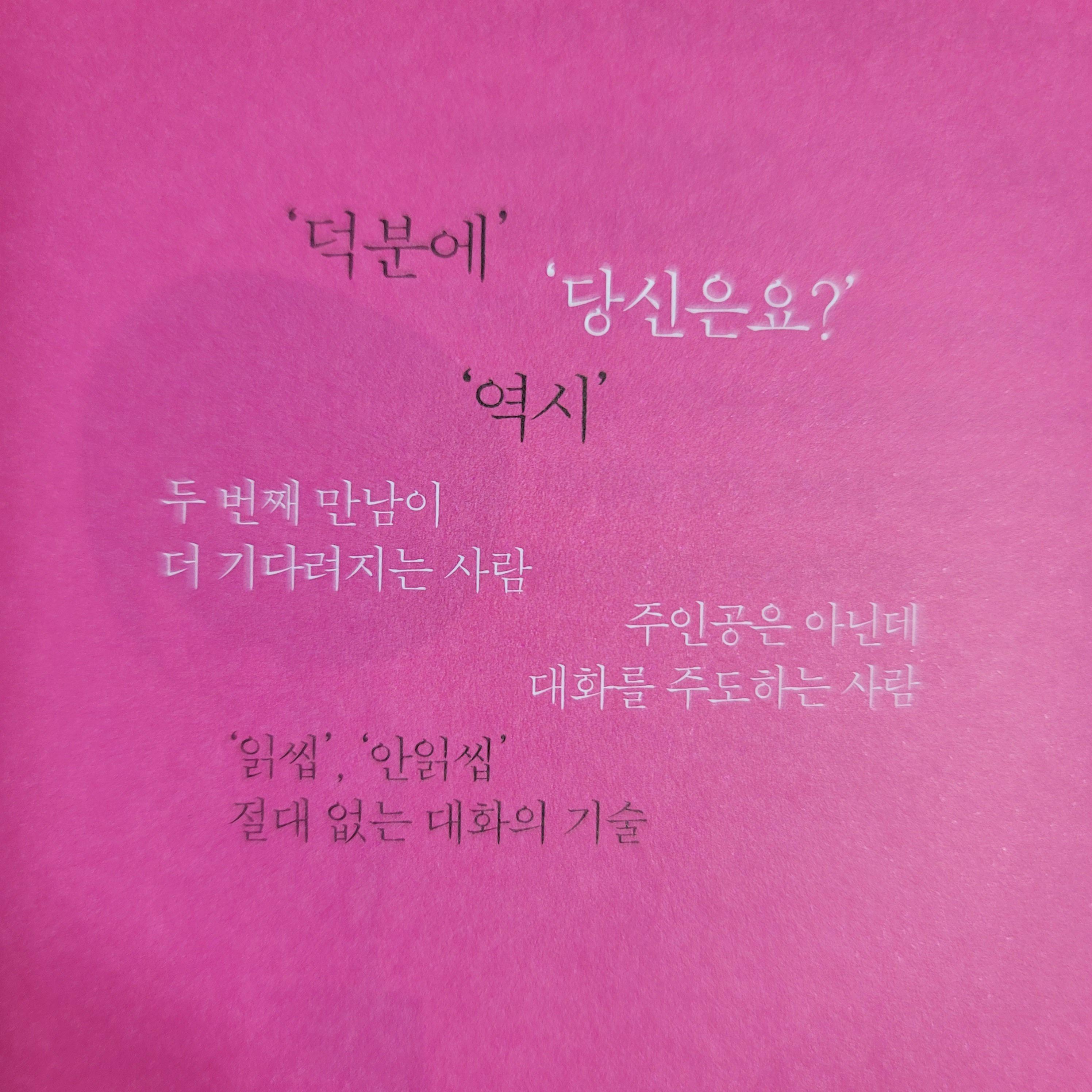 덕분에 당신은요 역시 두 번째 만남이 더 기다려지는 주인공은 아닌데 대화를 주도하는 사람이 될 수 있다. 파트 2의 나의 매력이 한층 올라가는 말, 상대의 작은 행동에도 관심 기울이기와 파트 8의 좋게 말하면 좋은 사람이 된다. 부분이 특히 자극을 주었다.